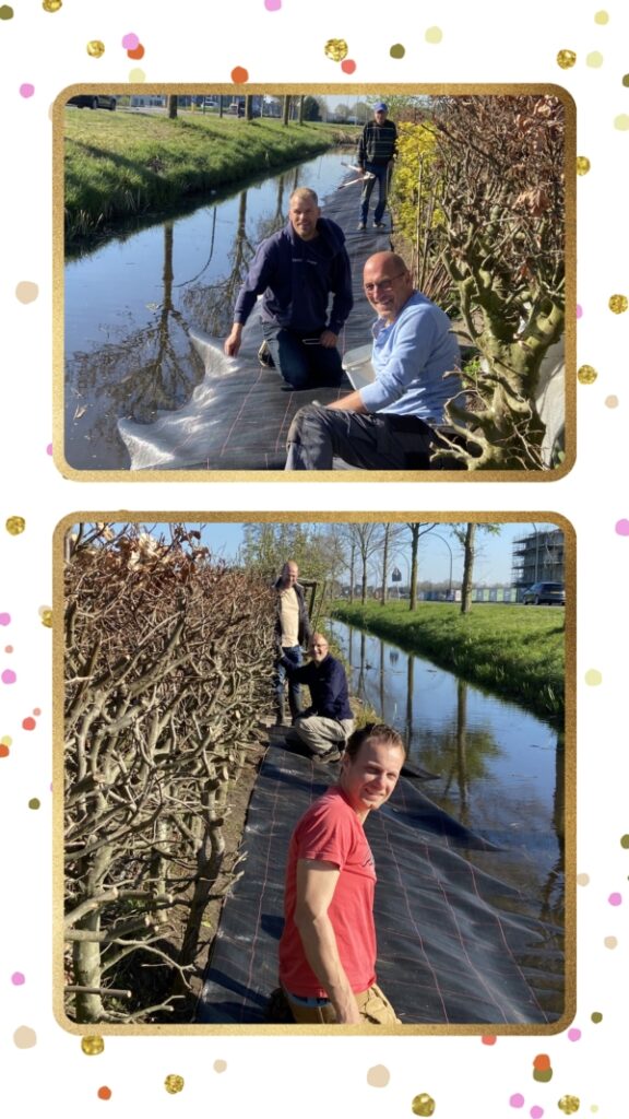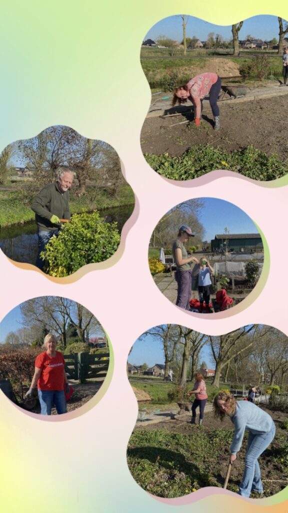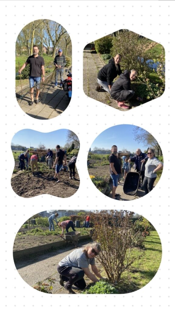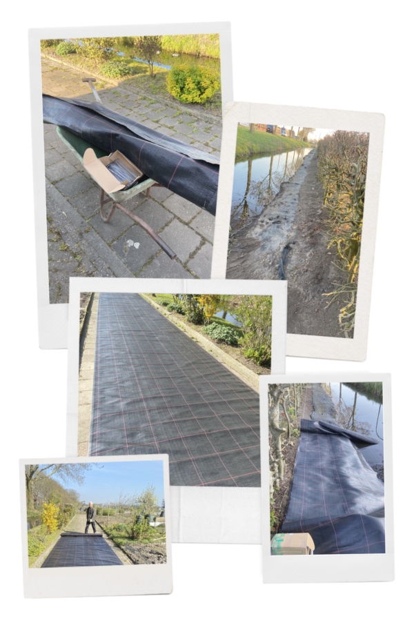 Na de flinke snoeiochtend van oktober kon er in april een nieuwe worteldoek gelegd worden aan de slootkant aan de oostkant van ons complex. Hiervoor waren vele handen nodig om het doek goed op zijn plaats te krijgen. Daarnaast moest er een volkstuin schoon opgeleverd worden aan de nieuwe huurders en was daarbij hulp nodig.